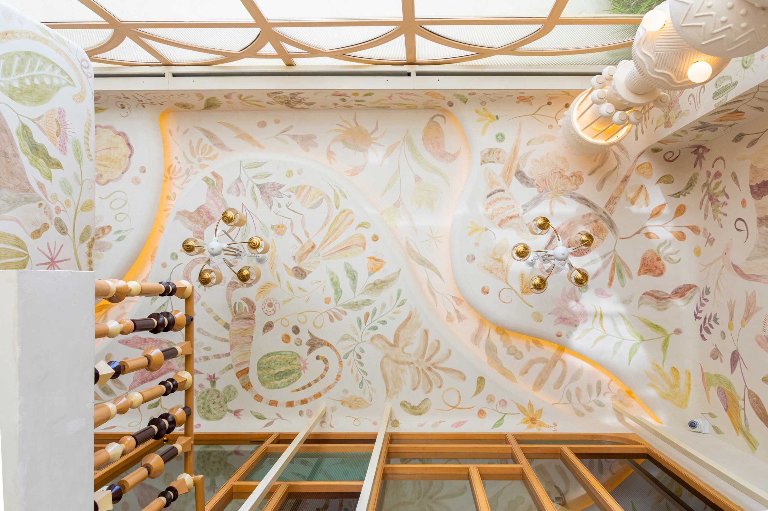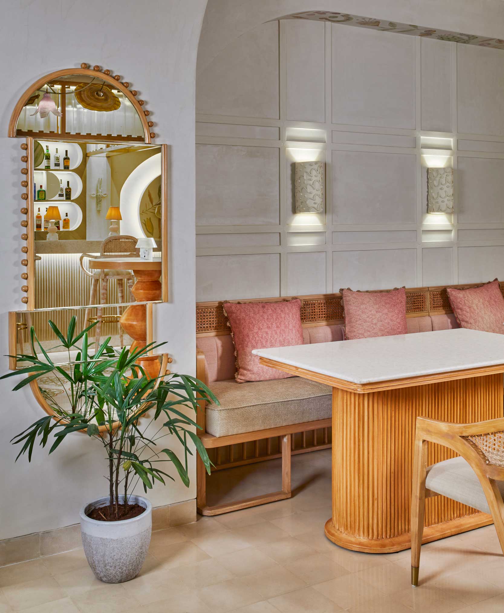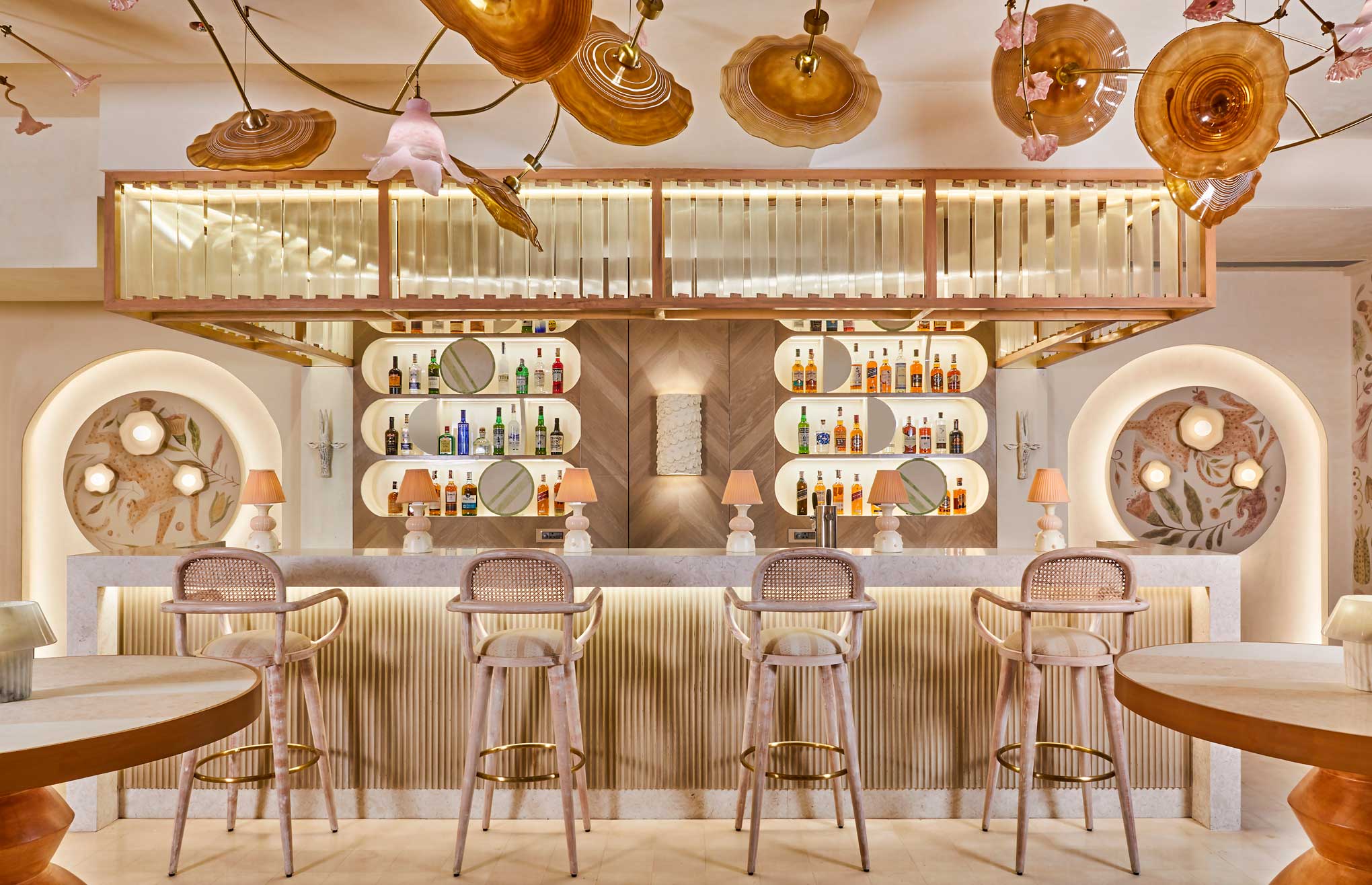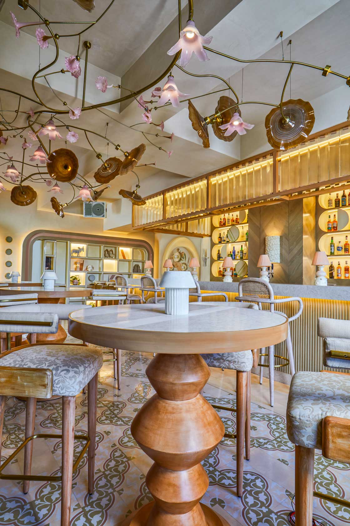 Cray Craft is a restaurant and bar designed as an ethereal symphony of textures and warmth, rooted in earthy elegance. The ground floor sets the tone with a high-energy bar, featuring a 16 foot counter, fluted details, stone, veneer, and a striking blown glass chandelier. A dramatic 21 foot clay light totem anchors the entrance, while floors with nature inspired motifs outlined in gold add artistry and charm.