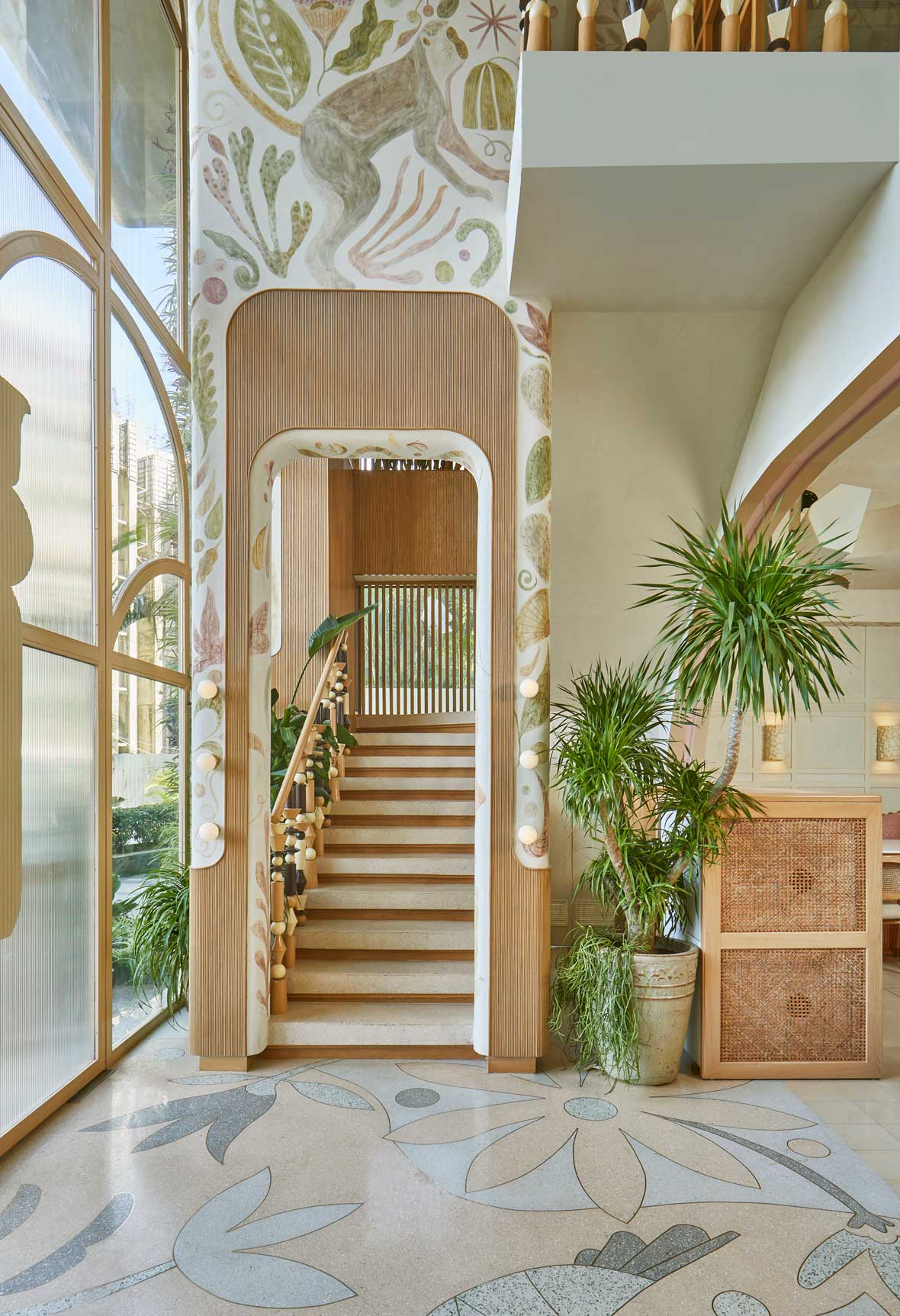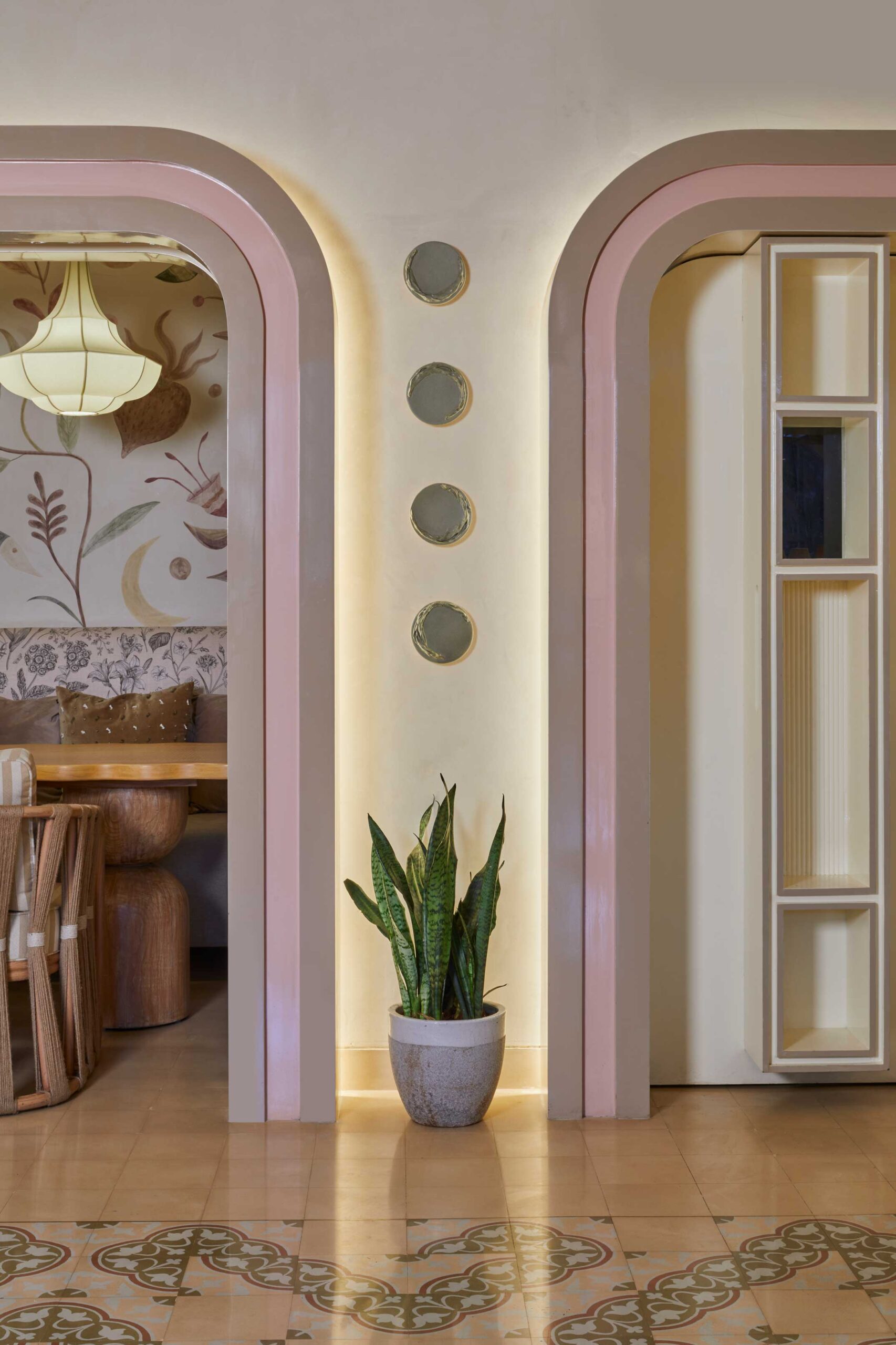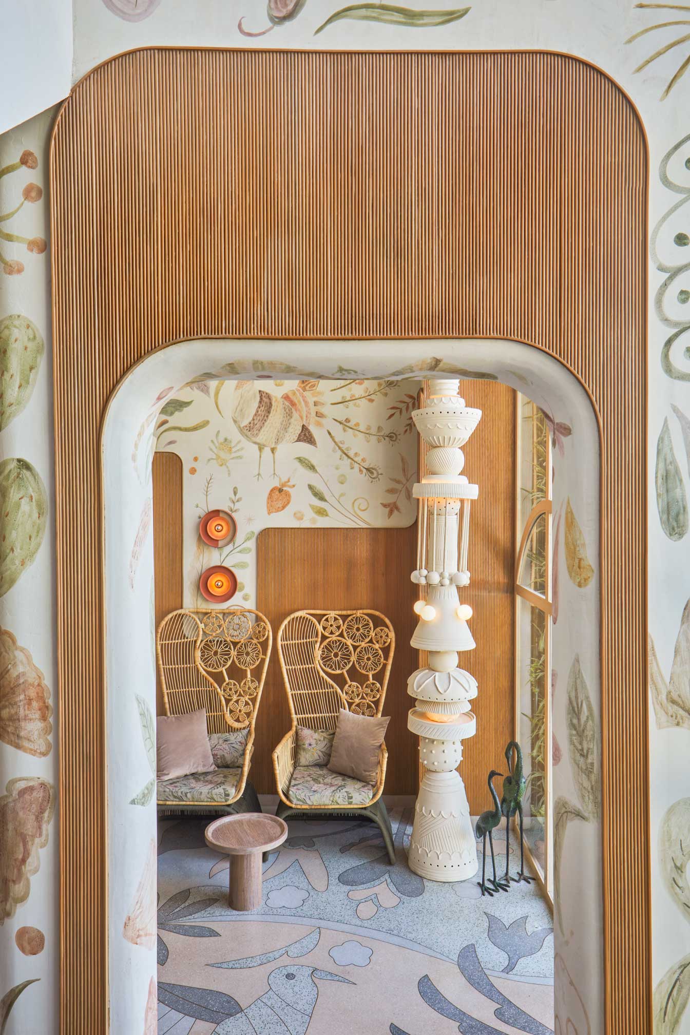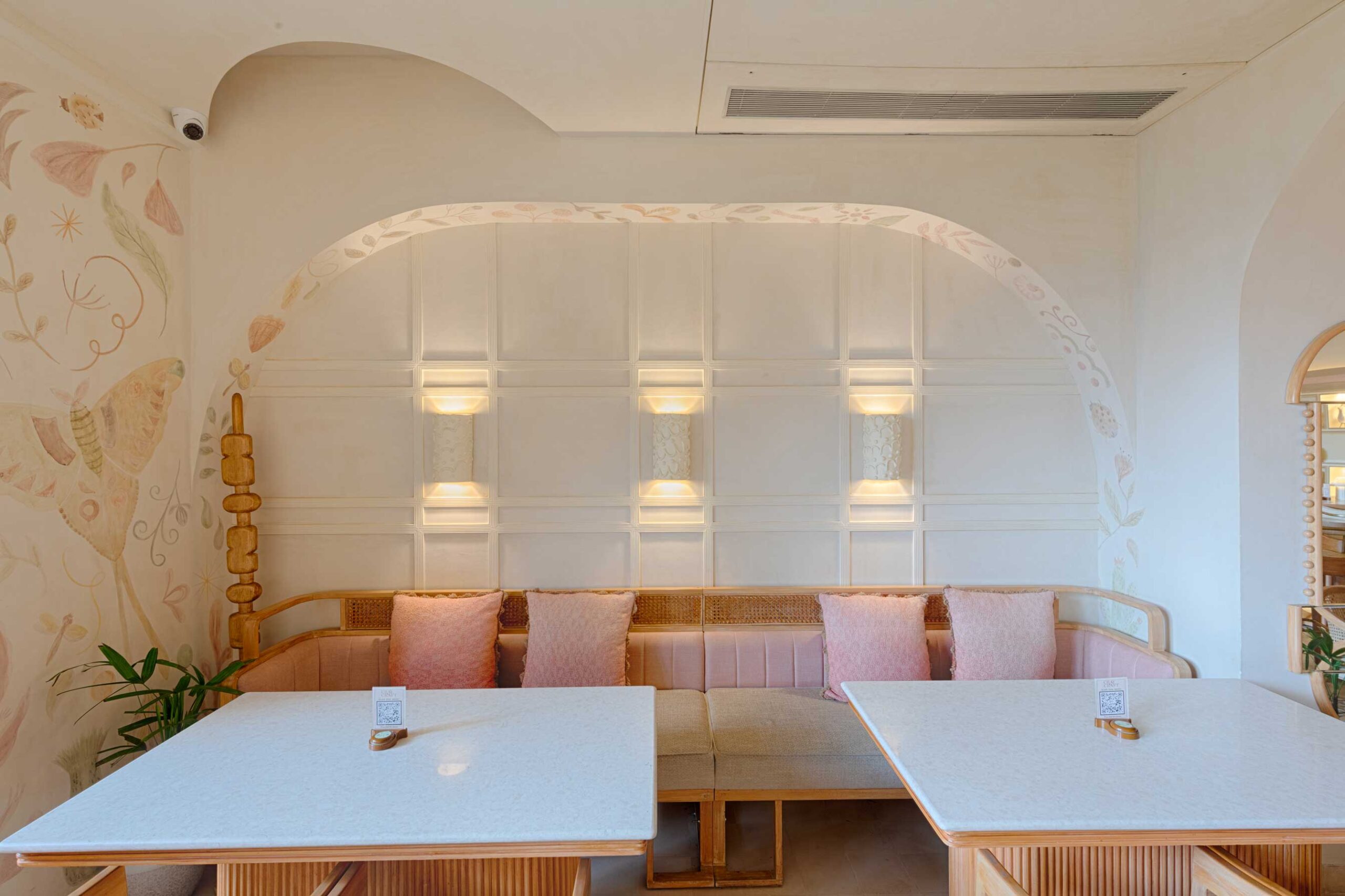 Cray Craft is a restaurant and bar designed as an ethereal symphony of textures and warmth, rooted in earthy elegance. The ground floor sets the tone with a high-energy bar, featuring a 16 foot counter, fluted details, stone, veneer, and a striking blown glass chandelier. A dramatic 21 foot clay light totem anchors the entrance, while floors with nature inspired motifs outlined in gold add artistry and charm.