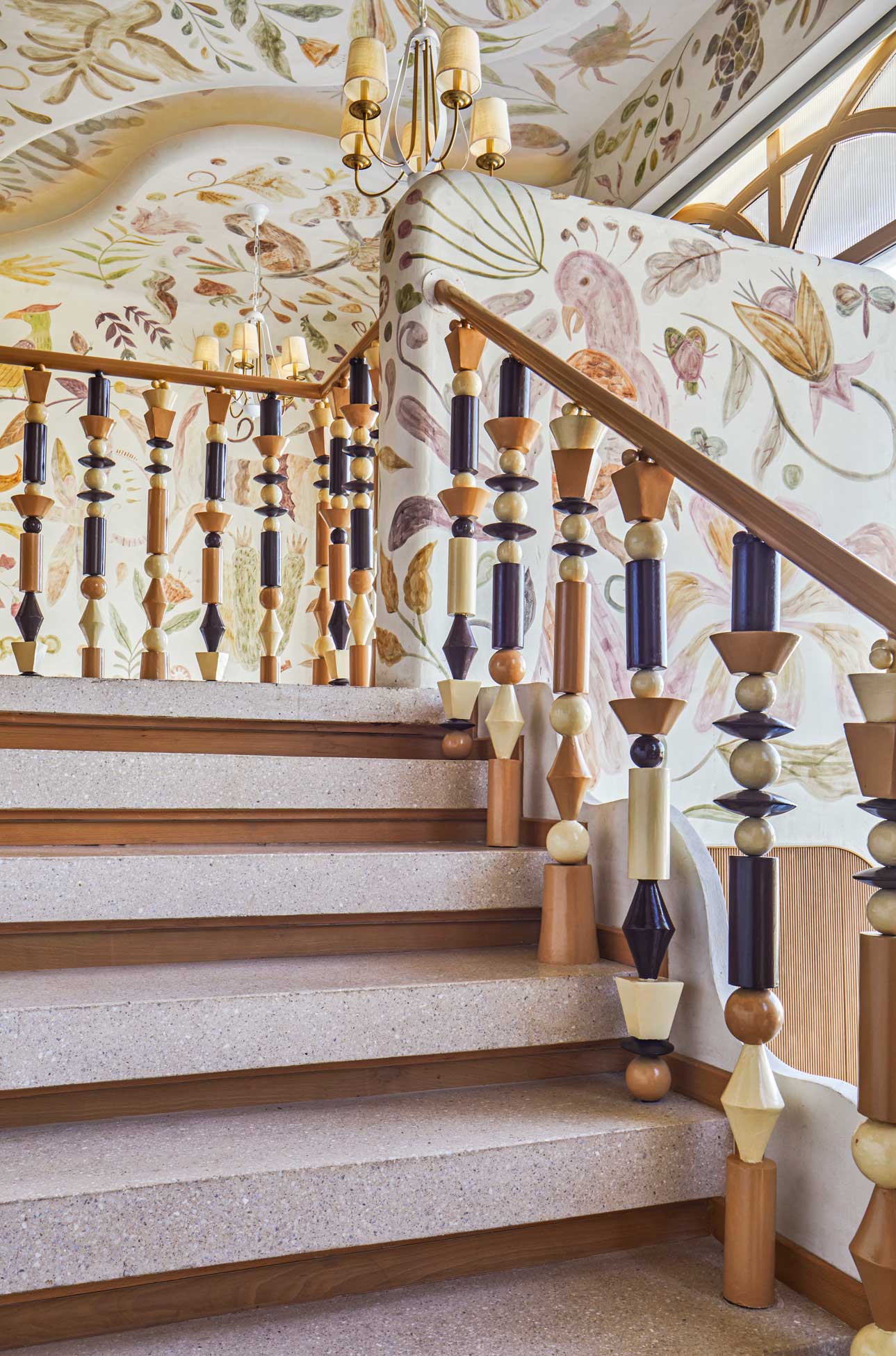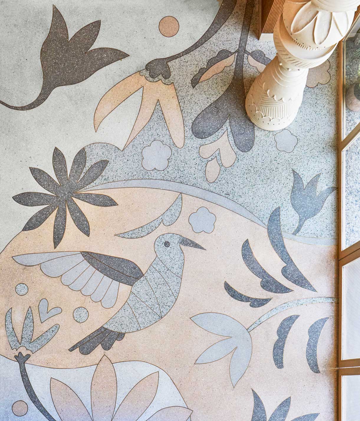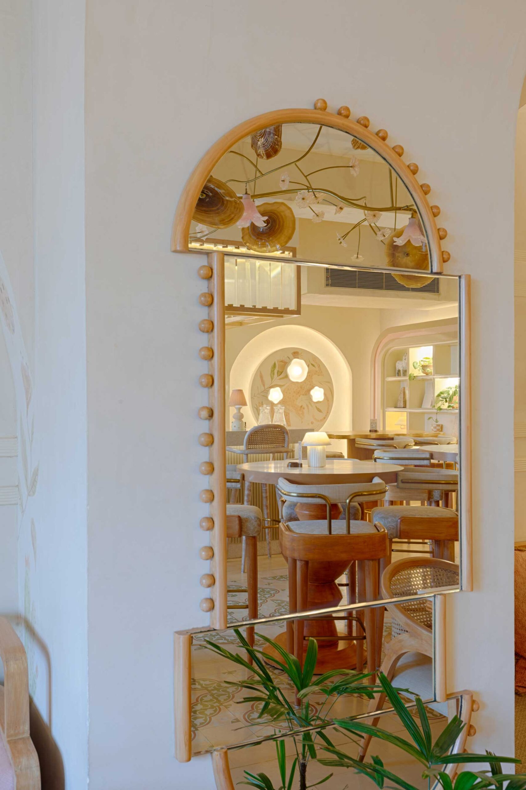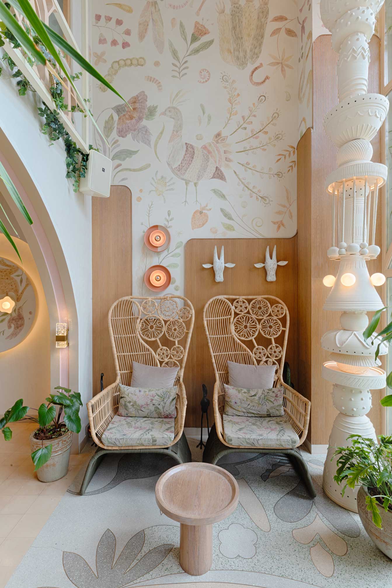 Cray Craft is a restaurant and bar designed as an ethereal symphony of textures and warmth, rooted in earthy elegance. The ground floor sets the tone with a high-energy bar, featuring a 16 foot counter, fluted details, stone, veneer, and a striking blown glass chandelier. A dramatic 21 foot clay light totem anchors the entrance, while floors with nature inspired motifs outlined in gold add artistry and charm.